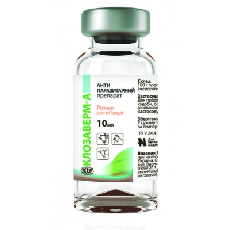 Клозаверм-А виявляє виражену активність проти трематод (Fasciola hepatica (у т.ч. личинок старше 6 тижнів), Dicrocoelium lanceatum); шлунково-кишкових і легеневих нематод (Bunostomum trigonocephalum, Bunostomum phlebotomum, Haemonchus contortus, Oesophagostomum radiatum, Oesophagostomum columbianum, Dictyocaulus filaria, Dictyocaulus viviparus, Ostertagia circumcincta, Ostertagia ostertagi, Nematodirus spp., Trichostrongylus spp., Chabertia ovis); личинок підшкірних оводів (Hypoderma bovis, Hypoderma lineatum, Oestrus ovis)', при ураженні вошами (сифункулятозах спричинених Heamatopinus eurysternus) у великої рогатої худоби; проти саркаптоїдних та псороптоїдних кліщів ('Psoroptes bovis, Psoroptes ovis, Sarcoptes bovis, Sarcoptes ovis, Sarcoptes caprae) у великої рогатої худоби, овець та кіз.